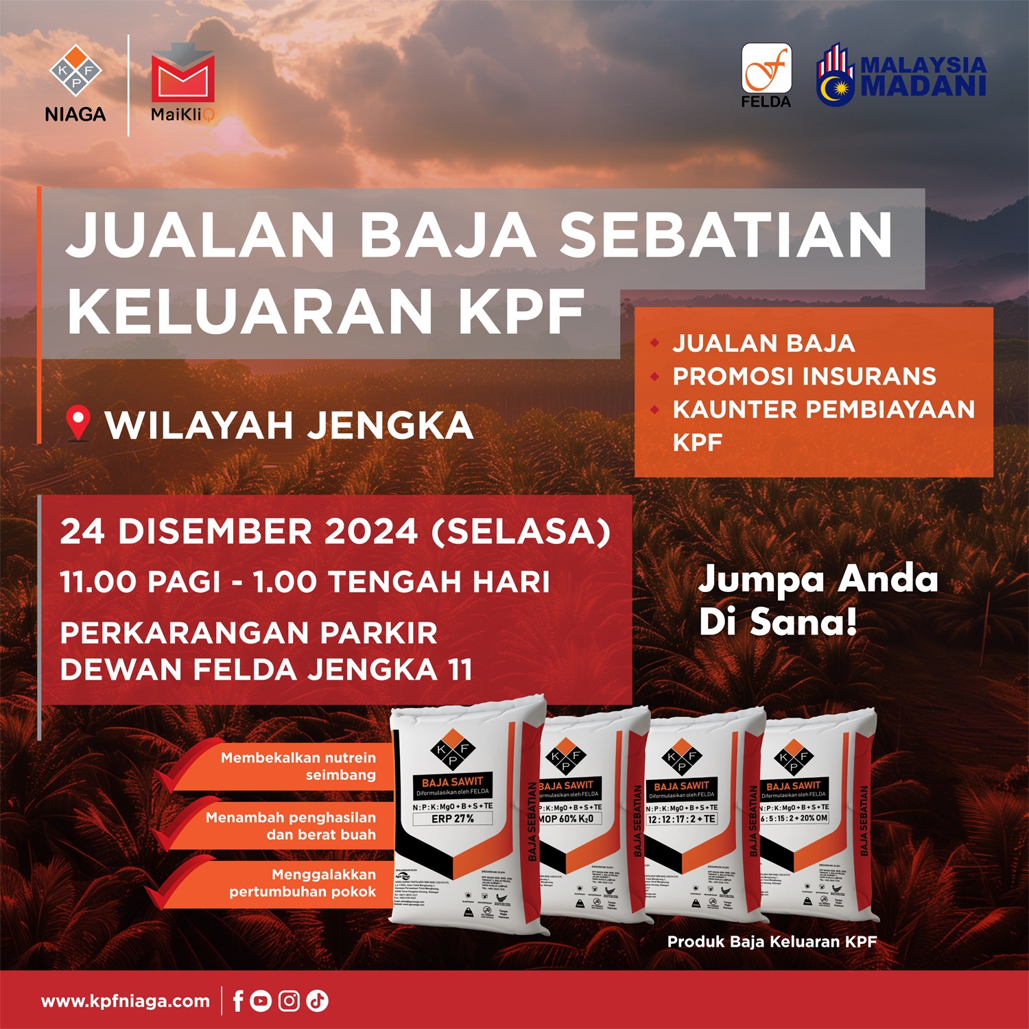 Program Penerangan Input Pertanian & MaiKliQ Kepada Rakan Muafakat BTS KPF @ Wilayah Jengka pada 24 Disember 2024 bermula jam 11.00 pagi sehingga 1.00 tengah hari yang bertempat di Dewan FELDA Jengka 11, Pahang Darul Makmur.